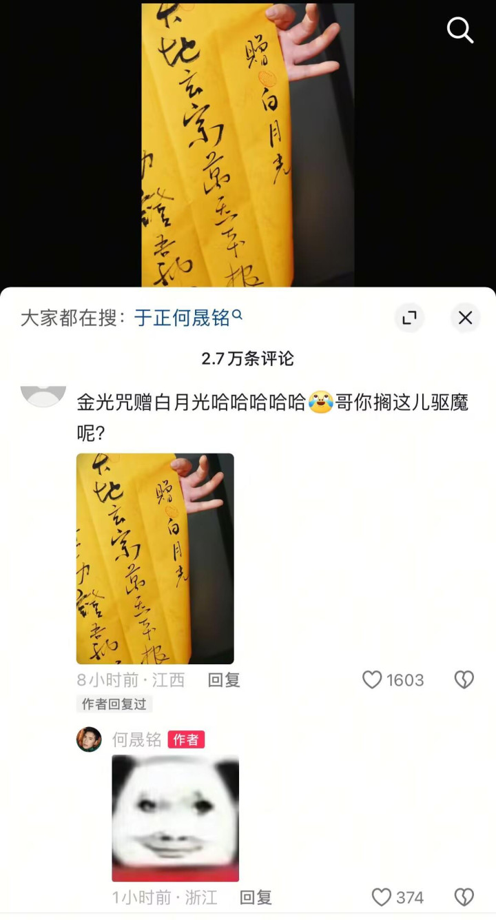 而在22日晚的视频中,何晟铭还在评论区与网友幽默互动,当网友询问:“金光咒赠白月光,哥你搁这儿驱魔呢?”他用了一个笑而不语的表情包。