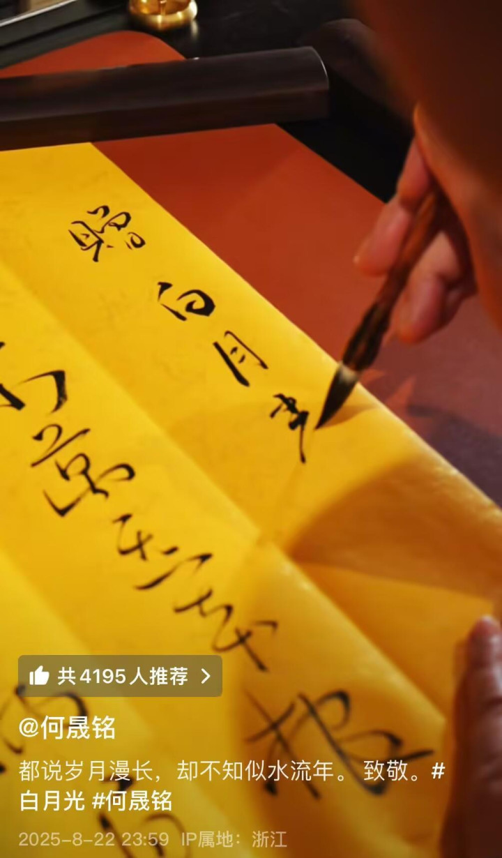 22日晚23:59,何晟铭在视频网站发布了手写金光神咒的视频,网友赫然发现,这幅当天下午他已发布在微博并配文“气定神闲”的书法作品,前面还有“赠白月光”四个大字,显然是在回应被卷入许荔莎、于正争端事件。