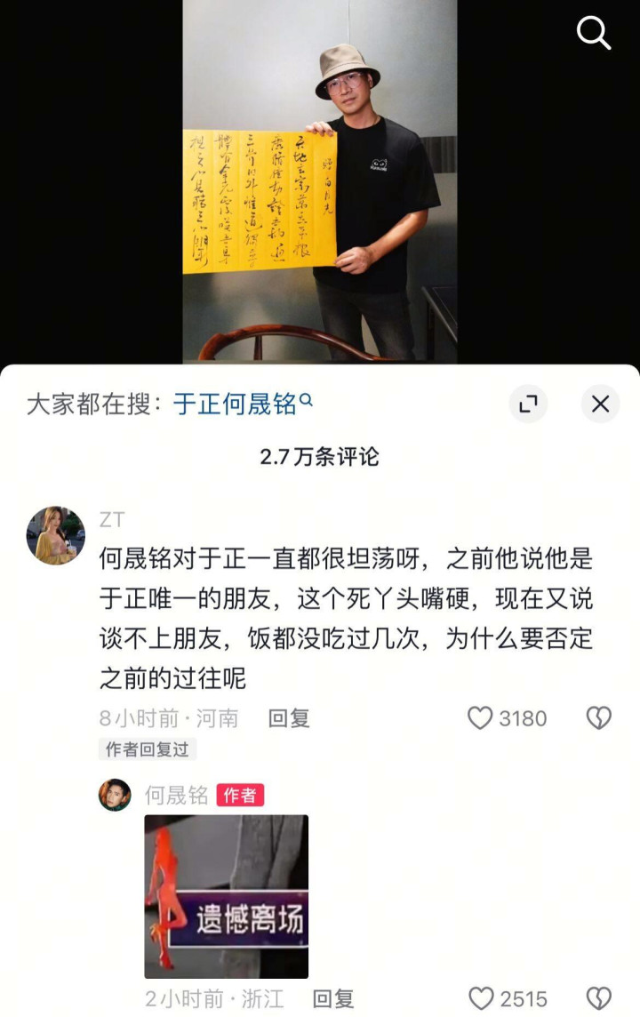 网友还在评论区提到,何晟铭以前说过于正是“唯一的朋友”,现在于正却表示“连朋友都算不上”的行为是“否认过往”,何晟铭贴出“遗憾离场”,让人忍俊不禁。