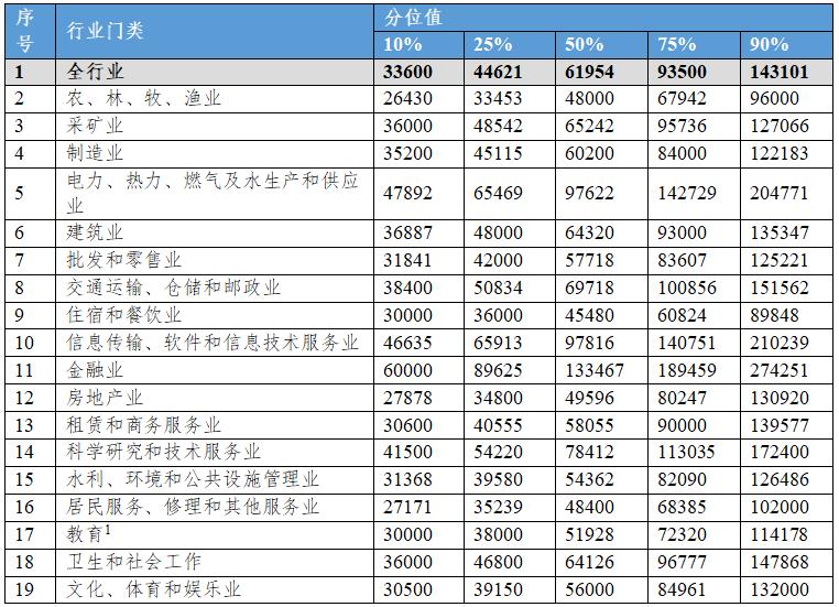 从行业工资价位来看,中位数排名前三的行业分别是金融业,信息传输、软件和信息技术服务业,电力、热力、燃气及水生产和供应业,分别为133467元/年、97816元/年、97622元/年。