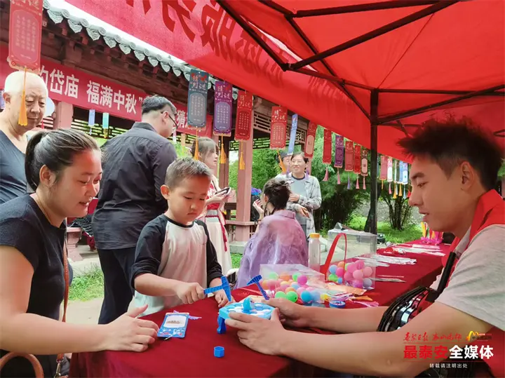 趣味互动环节则点燃了现场参与热情。红、黄、橙等中秋主题色系的谜题纸悬挂于展区,谜题聚焦中秋民俗与岱庙文化知识,游客答对即可获赠岱庙文创产品与月饼。同步开展的中秋传统竞技挑战中,泰山科技学院志愿者身着汉服,引导游客体验踢毽子、蹦跳球等项目,获胜者可赢取奖品,在趣味比拼中深化对传统文化的认知。